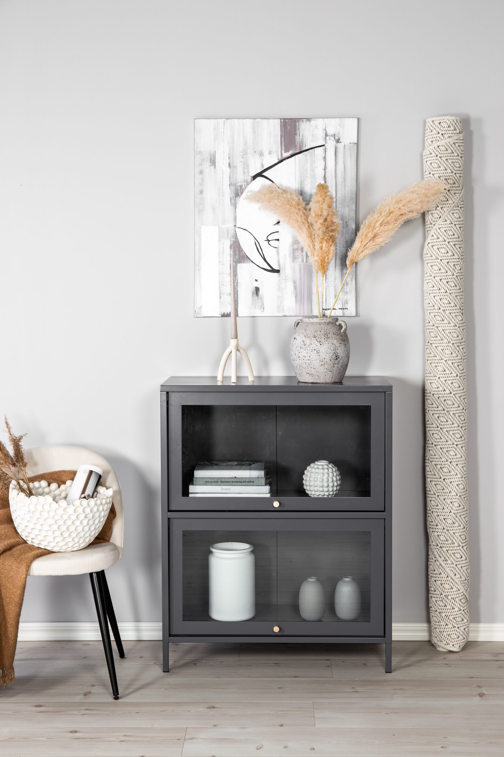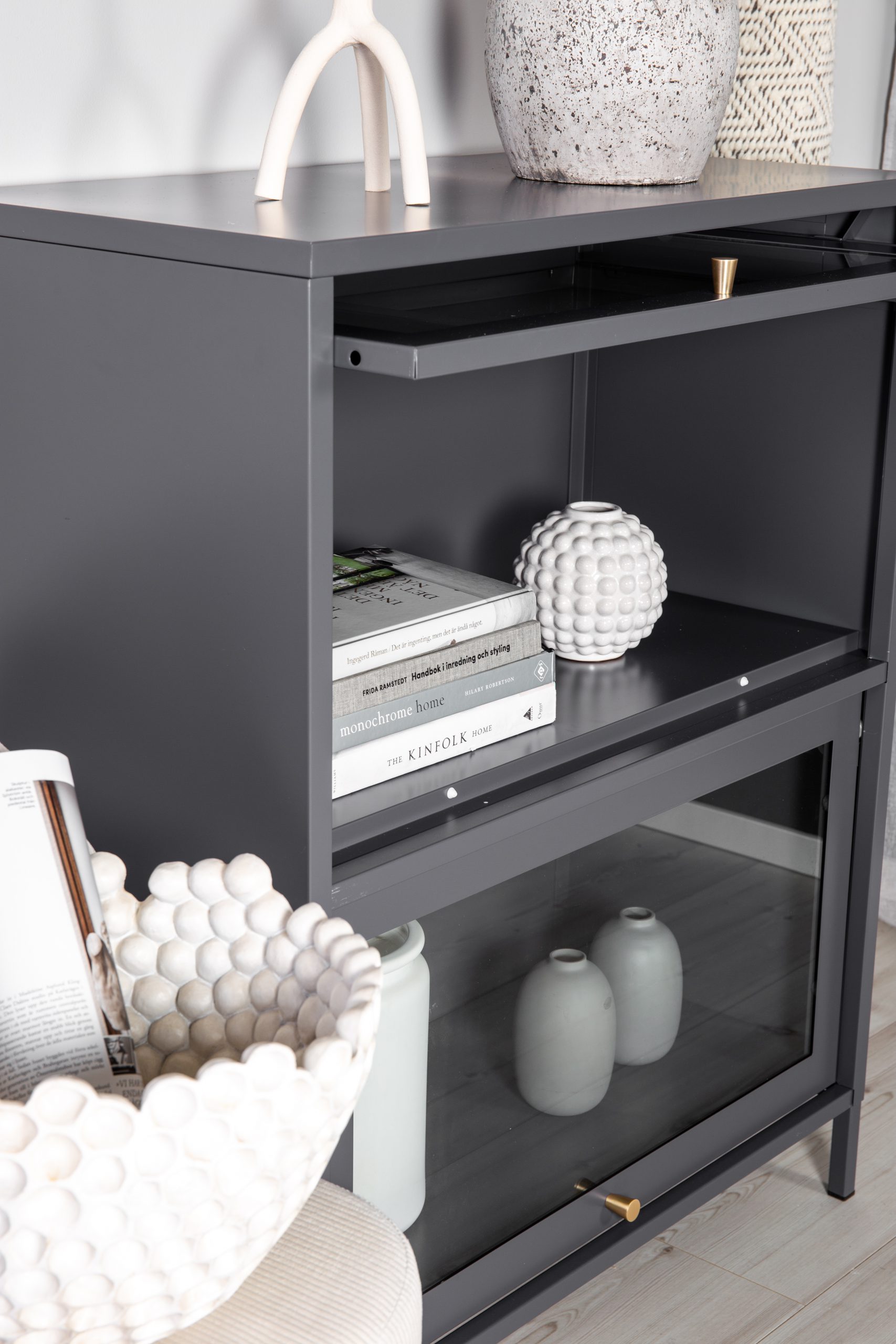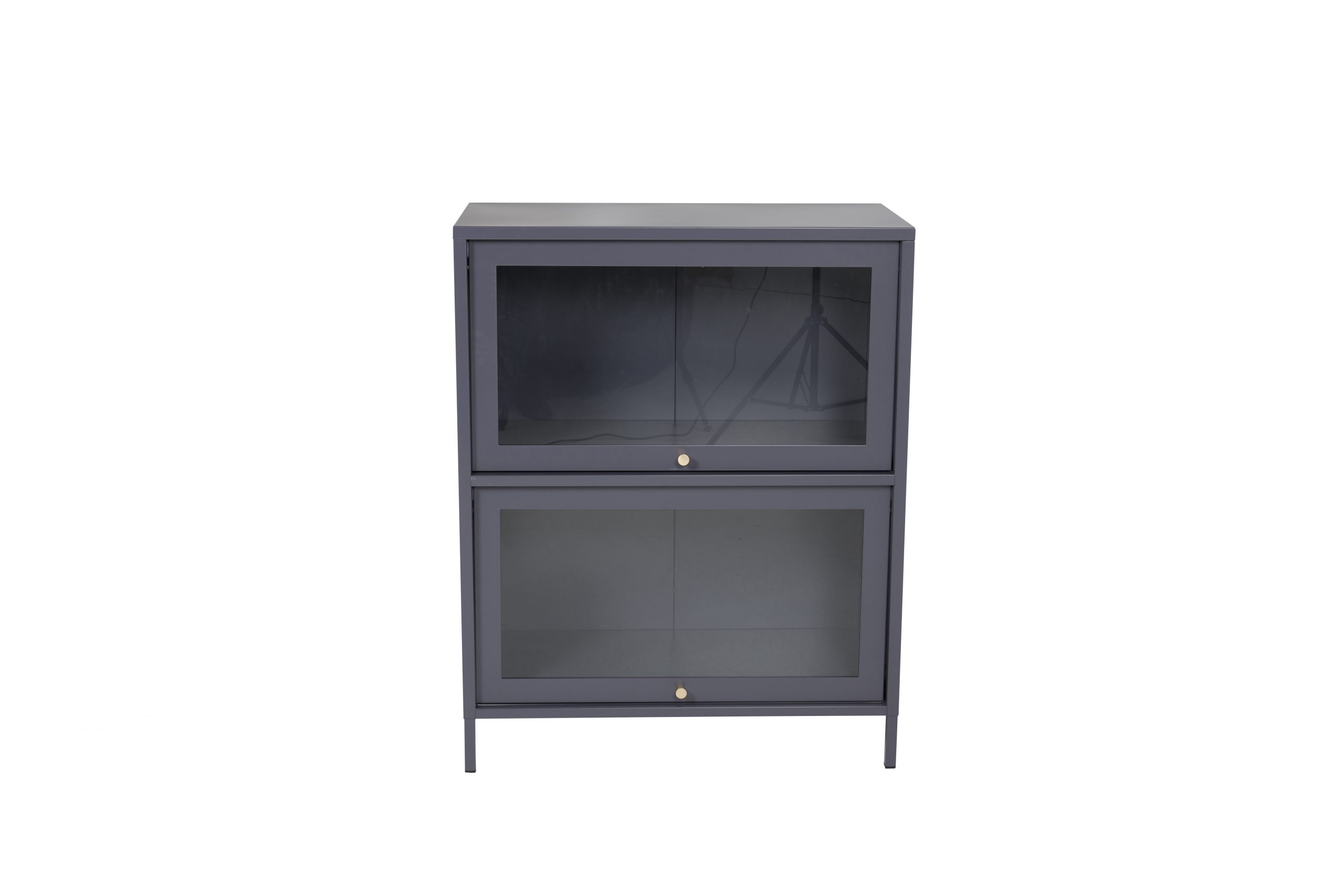 Bakal, i modern industriell design tillverkad i pulverlackerad ljusgrått stål med två glasdörrar. En ram av pulverlackerad ljusgrått stål samt mässingfärgade knoppar. Glasdörrarna öppnas uppåt. Vitrinskåpet vilar på fyra ben i pulverlackerad ljusgrått stål. Mått: Längd: 80 cm, Bredd: 40 cm, Höjd: 100 cm. Lättare montering krävs.