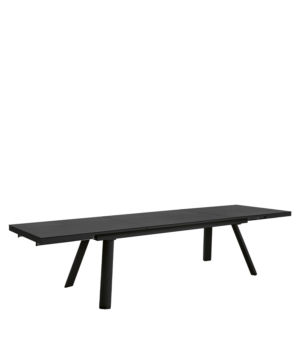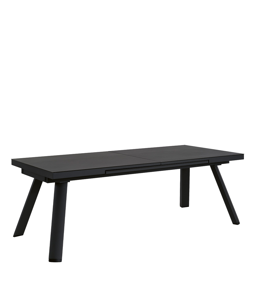 Bordet är utrustat med en inbyggd iläggsskiva som smidigt vrids på plats när bordet dras ut. Den integrerade lösningen gör det enkelt att anpassa bordets storlek vid behov, utan att kompromissa med design eller funktion. Underredet i pulverlackerad aluminium ger en stabil och tålig konstruktion anpassad för utomhusbruk.