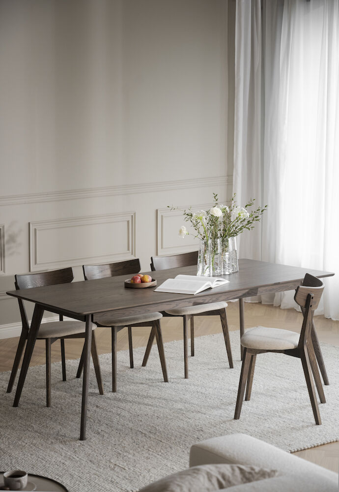 Yumi rektangulärt matbord med lätt utställda ben har en tidlös skandinavisk design som håller år efter år. Matbordet ingår i den älskade serien Yumi som är en av Rowico Homes mest populära serier. Bordsskivan består av brunlackad ekfaner. Matbordet kan kompletteras med upp till två tilläggsskivor och ger en maxlängd på 280 cm. Kombinera gärna med andra möbler i serien Yumi.